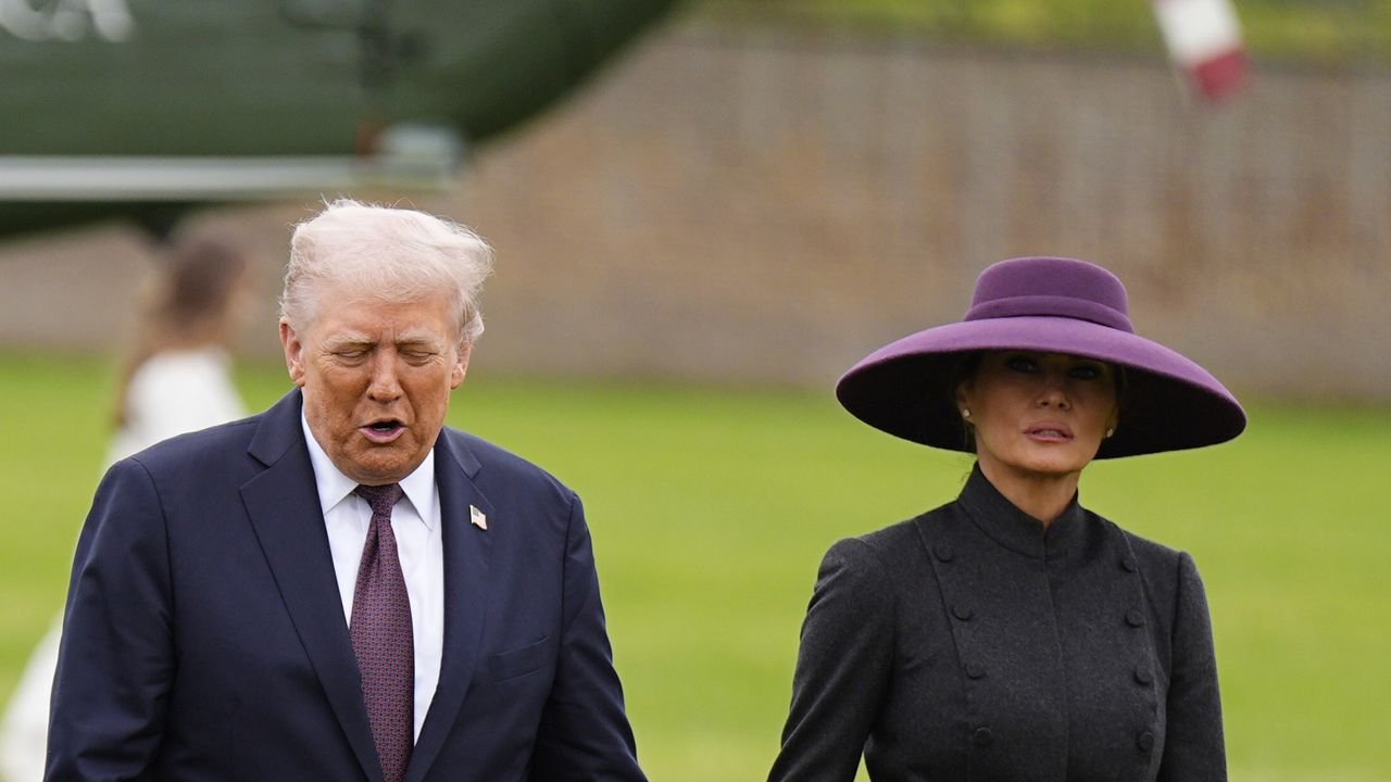 First Girl Melania Trump and Catherine, Princess of Wales brought a scheme of burgundy and mauve to meet at Windsor Castle, as the U.S state check out continues.<br />